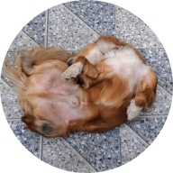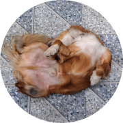 ảnh của Chú chó màu vàng nằm dưới sàn, ngửa bụng lên trỜi (mình không tìm thấy đầu)